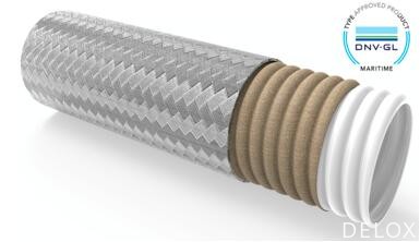 TapeWrap?系列MATWV & MATWL的密波紋狀PTFE,帶玻纖布覆蓋層和鋼絲編織增強(qiáng)層的阻燃波紋PTFE軟管,經(jīng)過設(shè)計(jì)的波紋結(jié)構(gòu),確保軟管的壓接更容易,已通過DNVGL型式認(rèn)可。若使用通過認(rèn)可的DNVGL接頭和套筒,在高溫下的預(yù)期壽命較為小為150000次脈沖周期。新的波紋結(jié)構(gòu)提高了耐真空能力,但其中負(fù)壓可能不利于軟管組件的使用壽命。