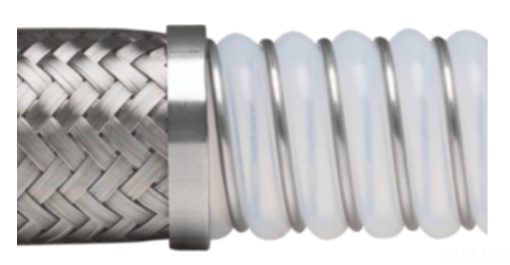 中型波紋PTFE鋼編管加螺旋鋼絲Convoflex?系列,中層螺旋鋼絲環(huán)繞在PTFE軟管波紋處,可有效防止折癟,并可增強(qiáng)高溫下耐負(fù)壓能力。食品制藥級(jí)材質(zhì),大流量設(shè)計(jì),內(nèi)部易于排水和清洗,耐高溫和低溫,耐強(qiáng)腐蝕,加厚的PTFE使抗?jié)B透性加強(qiáng),使用壽命延長(zhǎng),可用于輸送各種化學(xué)液體。適合把PTFE翻邊至接頭密封面,實(shí)現(xiàn)全PTFE流體接觸面,防止物料對(duì)PTFE以外物質(zhì)的腐蝕風(fēng)險(xiǎn)。CXS電阻R≦106Ω。